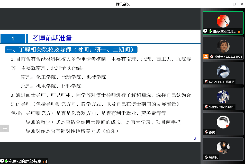 2022年6月21日下午4点,分享会于腾讯会议正式开始。即将前往南京理工大学、北京理工大学和同济大学攻读博士学位的寇勇、周近强、朱帅达和将入职兵器集团北化845厂、202所的张世林、张志新五位同学依次开讲,他们分享了自己在研究生学习、博士申请以及择业、就业中的宝贵经验,希望能对师弟师妹们有所帮助。