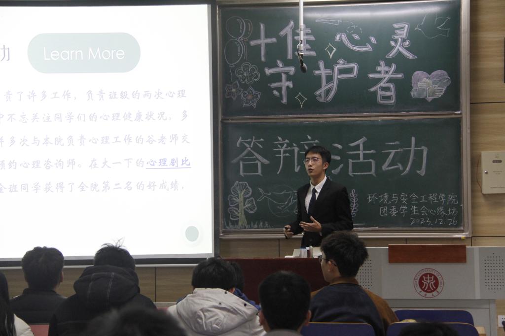 团委学生会心缘坊在9号教学楼103教室开展“十佳心灵守护者”的答辩活动。