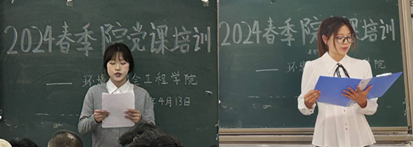 黄钰同学宣读了《入党积极分子联合培训班工作条例》,向全体积极分子介绍了入党流程以及本次培训班的相关纪律要求。张天怡同学代表全体学员发言,郑重承诺将严格遵守培训纪律,认真学习理论知识,积极参加实践课程,不忘初心,牢记使命,听党话、跟党走,努力提升自己的综合能力,让青春在全面建设社会主义现代化国家的火热实践中绽放绚丽之花。