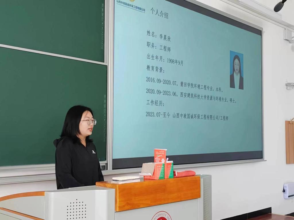 ,环境工程专业学士学位。2003年7月,毕业于西安建筑科技大学,资源与环境专业硕士学位。现任山西中政国诚环保工程有限公司环保工程师一职。她根据自身的求职经历,向学生们分享了求职经验,鼓励在做学生积极考研,提高学历,着眼当下,脚踏实地为就业做好充分的准备。