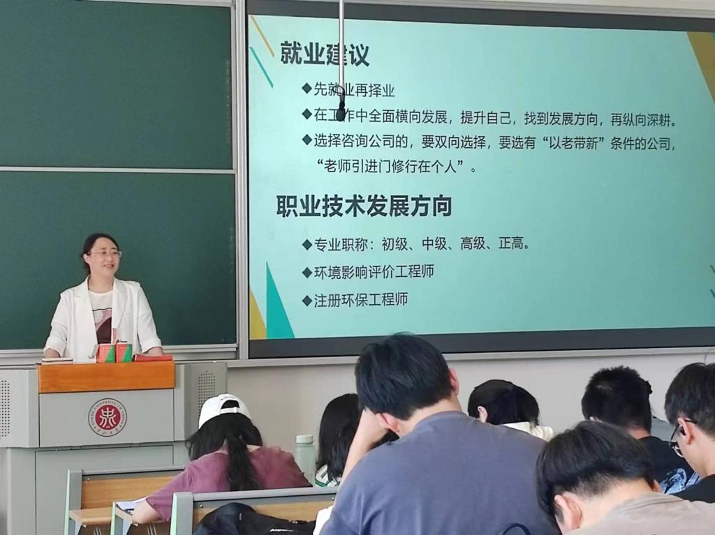 刘总工程师详细介绍了环境工程专业就业现状和发展方向,逐条分析了体制内、央企、国企、科研院所、设计院、社会企业就业要求和发展前景,重点介绍了环保技术咨询工作的内容、要求、服务对象、行业特点,建议同学们先就业再择业,在工作中全面横向发展,提升自己,找到发展方向再纵深发展。